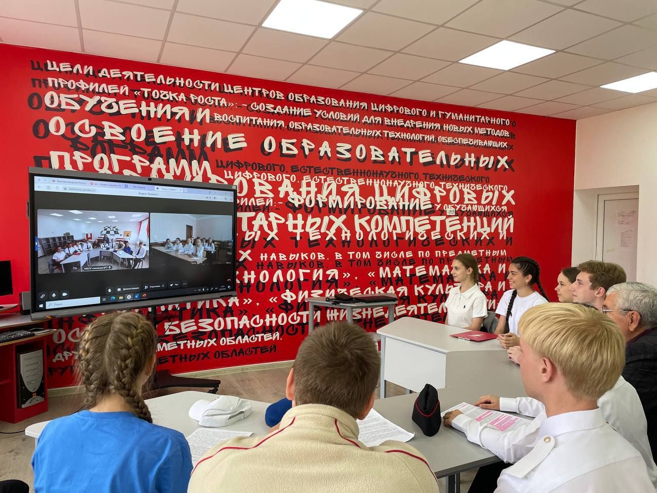 В исторический день телемост также состоялся между двумя гимназиями №7 – города Стаханова Луганской Народной Республики и села Донского Ставропольского края. Учащиеся обменялись опытом патриотической работы: гимназисты Ставрополья рассказали о деятельности юнармейского отряда «Слава» и ученической бригады «Ровесник», а их сверстники из ЛНР – о развитии пионерского движения и проекте «Луганский характер».