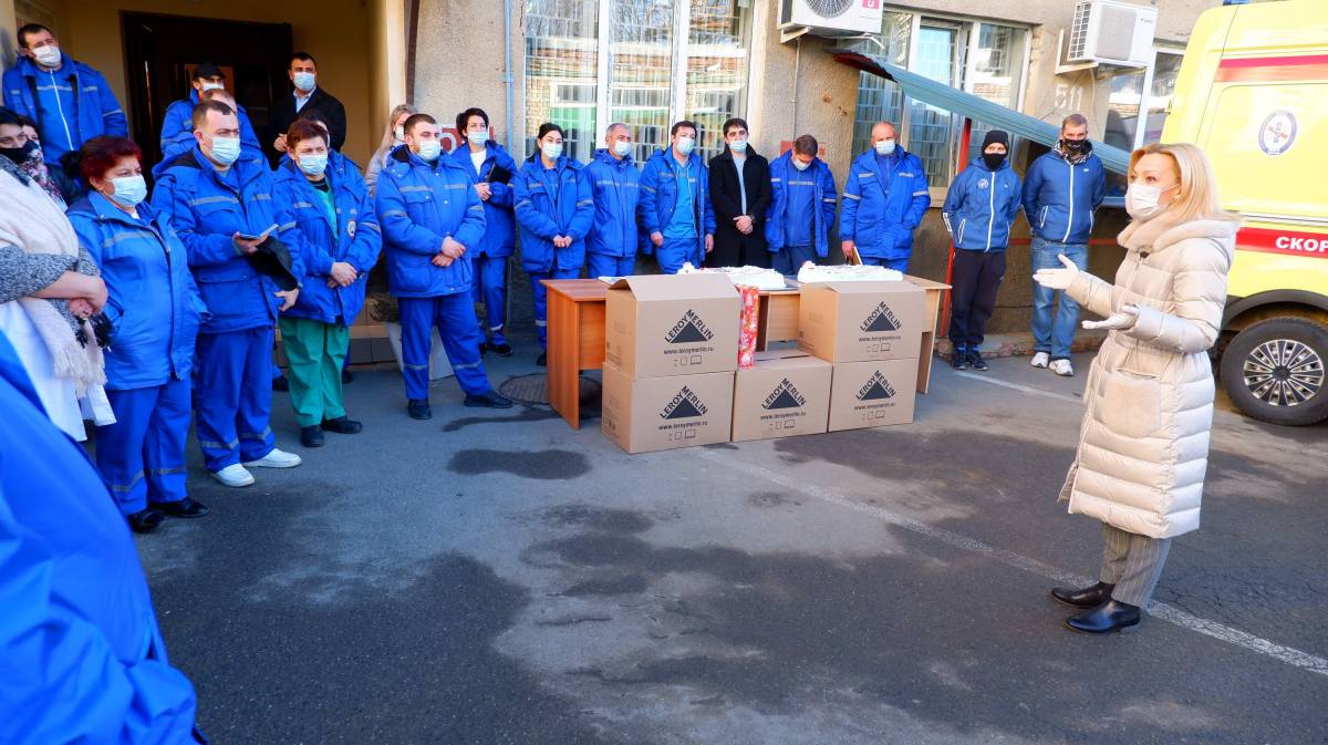 Вместе с волонтерами «Единой России» она приехала поддержать дежурные бригады, поблагодарить и поздравить их с наступающим Новым годом. С собой вице-спикер Госдумы привезла сладкие подарки - два больших 5-килограммовых торта, чай и кофе для новогодней смены, а также 140 специальных защитных медицинских костюмов.