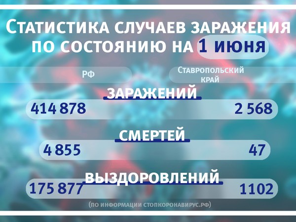 На территории Ставропольского края зарегистрировано 2 568 случая заражения коронавирусной инфекцией, в том числе за последние сутки +83 человека. Выписаны по выздоровлению 1102 человек, в том числе за последние сутки +35. Умерли от коронавирусной инфекции 47 человек.