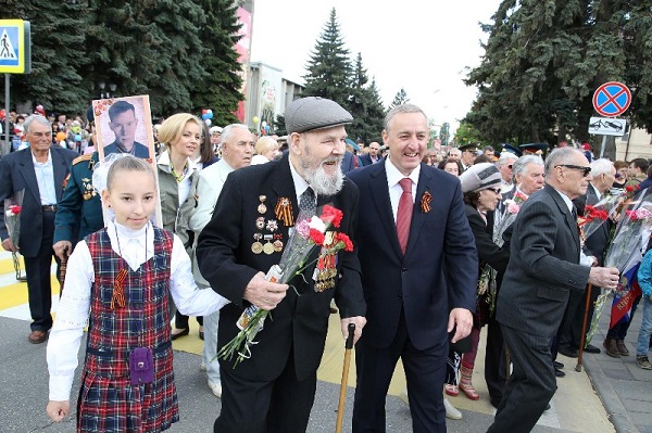 С раннего утра 9 мая улицы, площади, скверы, парки, проспекты и аллеи Пятигорска расцвели алыми флагами и триколором, наполнились цветущей сиренью, яркими гвоздиками и воздушными шарами, зазвучали фронтовыми песнями и звонким детским смехом. Главное действо праздничного дня развернулось в самом центре столицы округа. Парад Победы прошел по улице имени генерал-лейтенанта Козлова - Героя Советского Союза, командовавшего 37-й армией, освобождавшего Пятигорск от немецко-фашистских захватчиков. По традиции, первой на праздничную площадь вышла почетная колонна ветеранов Великой Отечественной. Вместе с фронтовиками в колонне прошли секретарь Пятигорского отделения партии «Единая Россия» глава города Лев Травнев, начальник отдела военного комиссариата Ставропольского края по городам Пятигорску и Лермонтову Валерий Гусоев, депутат-единоросс Государственной Думы РФ Ольга Казакова, заместитель председателя правительства Ставропольского края Ирина Кувалдина, депутаты краевой и городской Думы, представители администрации Пятигорска.